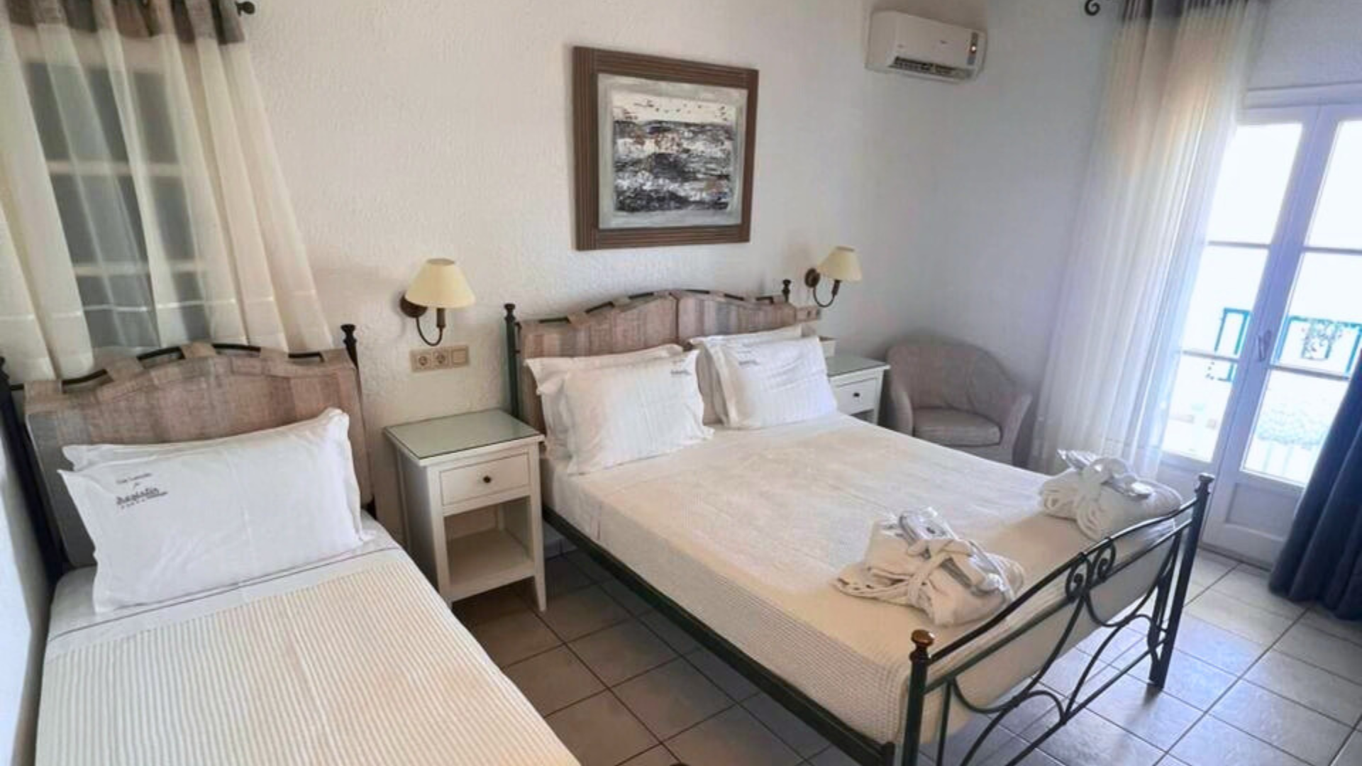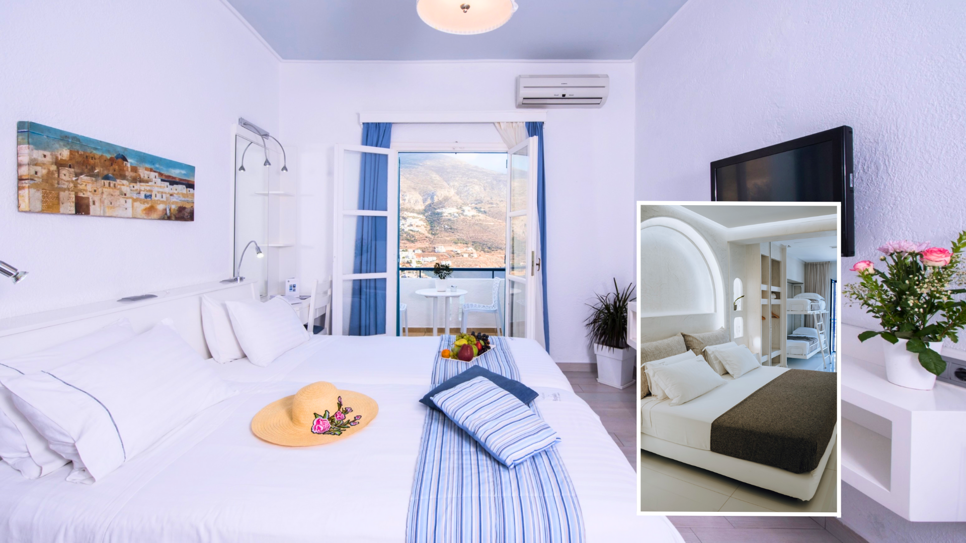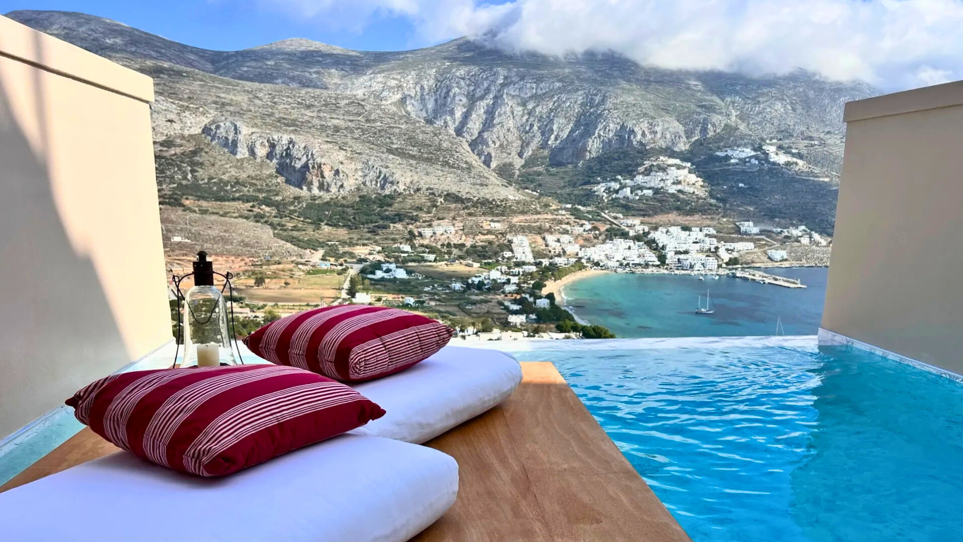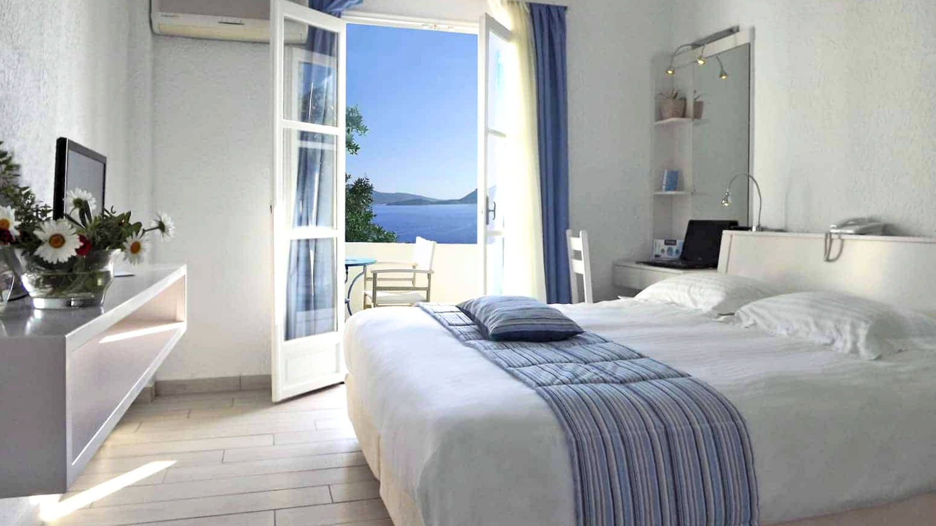 Handcrafted iron beds and timeless furnishings with stunning views of Aegiali Bay.